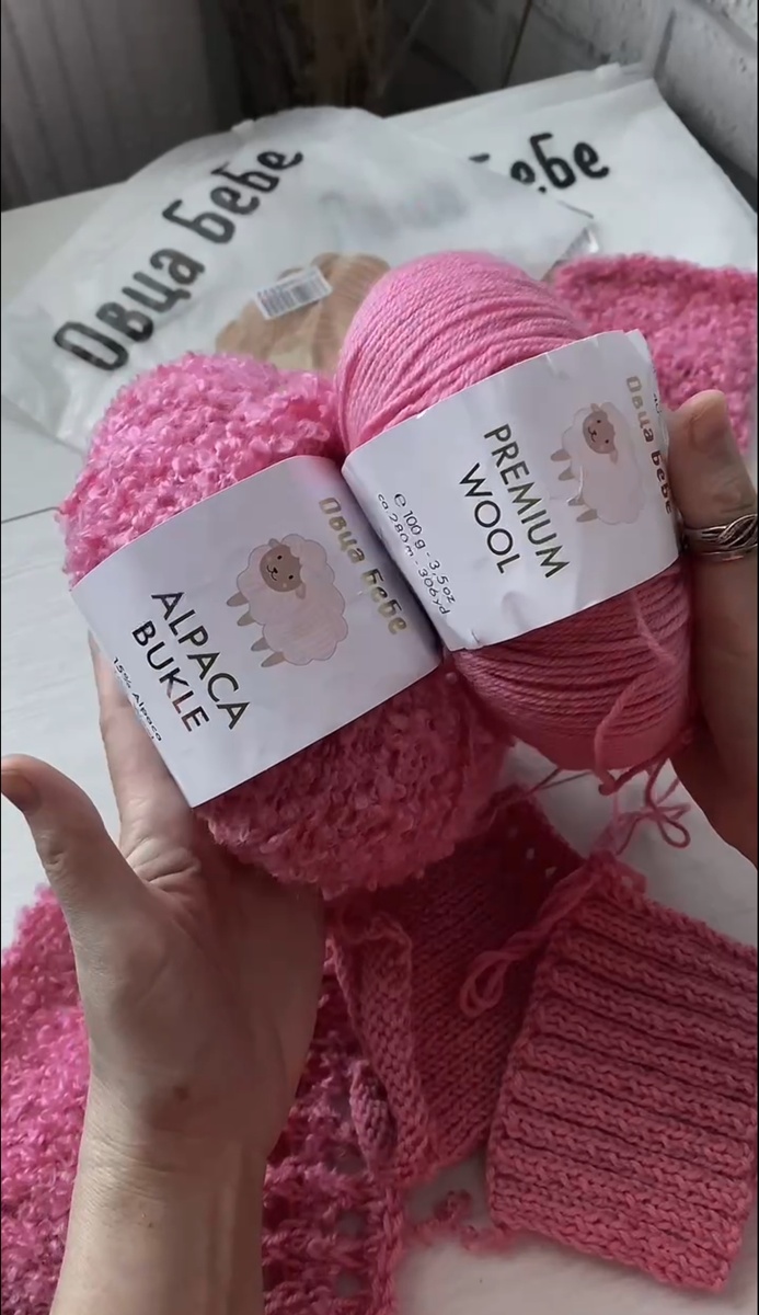 Представляем вам, наш любимый дуэт фактур двух пряж 😍 Первая — «Альпака Букле». 160 метров на 100 грамм, спицы №7–8. В составе 15% альпаки, 30% шерсти, 55% акрила. Нить с характером. Неровная, с петельками и узелками по всей длине. Она не просит сложных узоров — платочной вязки достаточно, чтобы вещь выглядела фактурно и дорого. Это пряжа для объема, для той самой уютной небрежности, за которую на маркетплейсах просят лишние деньги. Но есть нюанс: будучи объемной, она не всегда идеально держит мелкие детали. Манжеты, планки, резинки — там ей чуть-чуть не хватает дисциплины. Вторая — «Премиум Вул». 280 метров на 100 грамм, спицы №3–4. Состав: 60% премиальной мериносовой шерсти, 40% акрила. Здесь всё иначе. Ниточка ровная, гладкая, эластичная. Меринос — мягкий, не колется, можно на голое тело. Акрил отвечает за форму: вещи не вытягиваются, не садятся, живут долго. Это пряжа для четких линий, для аккуратной посадки, для тех самых резинок, которые не расползаются после первой стирки. И ту