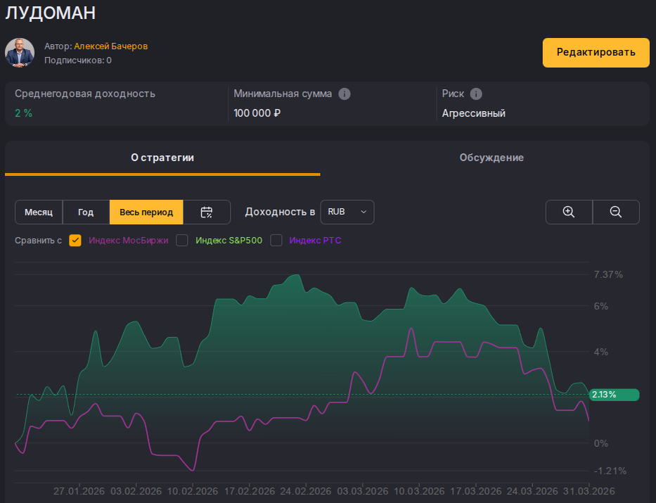 Сегодня начало месяца, а значит пару дней буду занят ребалансировками портфелей. Ещё сегодня день шуток. Надеюсь вам удастся кого-нибудь разыграть, и постараться разгадать розыгрыши, которые были затеяны против вас. Также сегодня юбилей канала Finversia. 10 лет это большой срок и проверка временем. Вечером в 19-00 стартует эфир, посвященный этому событию, и уверен, что в нём будет достаточно юмора на финансовые и инвестиционные темы. Присоединяйтесь ➡️ Я не долго думал, какой сегодня написать пост. Мой эксперимент "Определяем роль случайности в инвестициях" с одной стороны является серьёзным с делом, с другой оставляет немало пространства для юмора, сатиры и сарказма. Поэтому нет ничего проще, чем периодически демонстрировать его результаты, давая колкие комментарии. Итак, в лидерах альфы по отношению индексу портфель ЛУДОМАН 😀 ✅ ЛУДОМАН - цель портфеля показать самый плохой результат по итогу года. Был сформирован из 10-ти бумаг входящих в IMOEX, голосование по нему прошло в январе