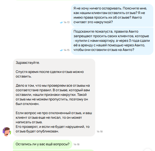 Предприниматели тратят огромное количество денег на привлечение клиентов. Но если у тебя нет отзывов то привлекать клиентов сильно сложнее. И вот мы решили, попросить своих клиентов, кому услугу уже оказали, написать отзыв. Обратились к дважды клиенту. 3 года назад купили с ним студию, а месяц назад сдали её в аренду. после сделки попросили написать отзыв. Отзыв написали, но его авито не опубликовал. Причина: нарушение правил Авито. В чём конкретно нарушение служба поддержки авито написала в переписке. Очень трудно сохранять правила человеческого общения, получая такой нечеловечесский сервис. А вы сталкивались с подобным?
