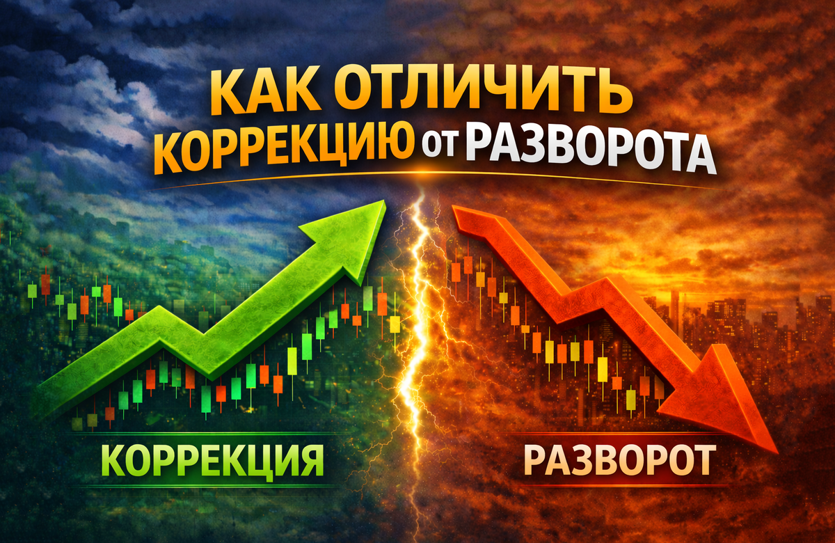 Проблема в том, что внешне коррекция и разворот действительно могут быть похожи. В обоих случаях цена откатывается, ломает локальную структуру, иногда даже резко ускоряется. Но смысл у этих движений разный. Коррекция — это передышка внутри текущего тренда. Разворот — это смена самой рыночной тенденции.