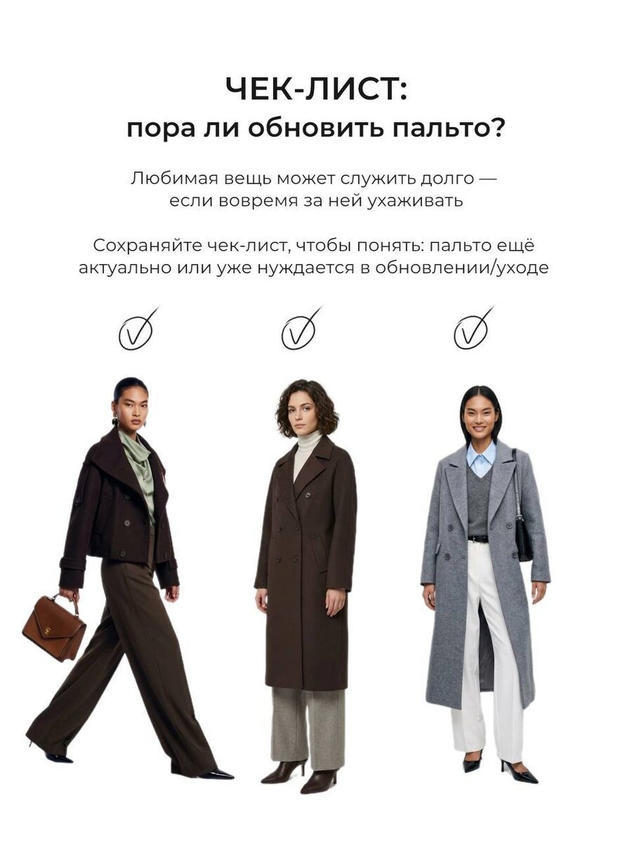 ? 🧥✨ Любимая вещь может служить долго — если вовремя за ней ухаживать. Сохраняйте чек-лист, чтобы понять: пальто ещё актуально или уже нуждается в обновлении/уходе 👇 5 признаков “уставшего” пальто: 1️⃣ Потеря формы Плечи “провисли”, силуэт стал мягким и не держит линию — образ теряет аккуратность. 2️⃣ Катышки и износ ткани Особенно в зоне рукавов и боков — сразу выдают усталость вещи. 3️⃣ Потёртости и выцветание Цвет стал менее глубоким, появились следы носки — пальто уже не выглядит свежим. 4️⃣ Загрязнения и следы носки Воротник, манжеты и карманы — зоны, которые первыми теряют аккуратный вид. 5️⃣ Фурнитура и детали Пуговицы, подкладка, швы — если есть износ, это влияет на общее впечатление. ✨ Если пальто в хорошем состоянии — достаточно химчистки, и оно снова как новое. ✨ Если большинство пунктов совпало — возможно, пора обновить гардероб. 💫 Rianty — за вещи, которые выглядят безупречно каждый день.