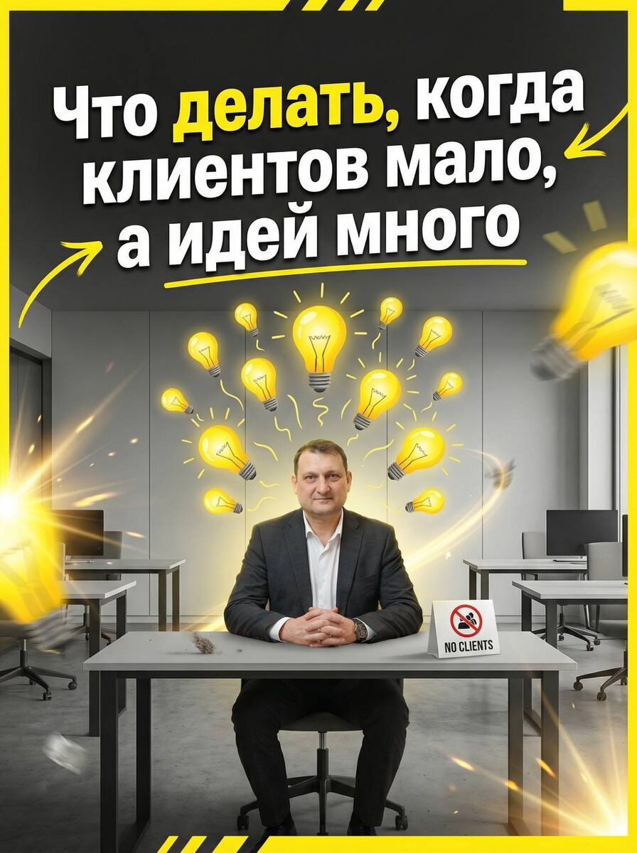 Клиентов мало. Но идей хоть отбавляй. Новый продукт, другая цена, запустить рекламу, переделать сайт, выйти в новую соцсеть. Список растёт, а выручка нет. Идеи — это не действия Придумывать приятно. Это даёт ощущение что что-то происходит. Но пока вы шлифуете очередную идею, дела стоят на месте. Новая идея не приводит клиента, а приводит действие. 🤔Почему клиентов мало — на самом деле Чаще всего не потому что продукт плохой. А потому что: 1️⃣О вас просто не знают. Вы работаете, стараетесь, но нужные люди о вас не слышали. Хороший продукт сам себя не продаёт. 2️⃣Вас видели, но забыли. Один пост, одна встреча, одно упоминание. Человек отвлёкся и ушёл. Доверие строится через повторение, а не через разовый контакт. 3️⃣Непонятно зачем идти именно к вам. Не потому что вы хуже, а потому что это нигде не видно. 🧠 Больше идей — меньше результата Когда берёшься за всё сразу — не получается ничего нормально. Три месяца суеты, куча потраченных сил, а воронка пустая. Это не стратегия. Это топ