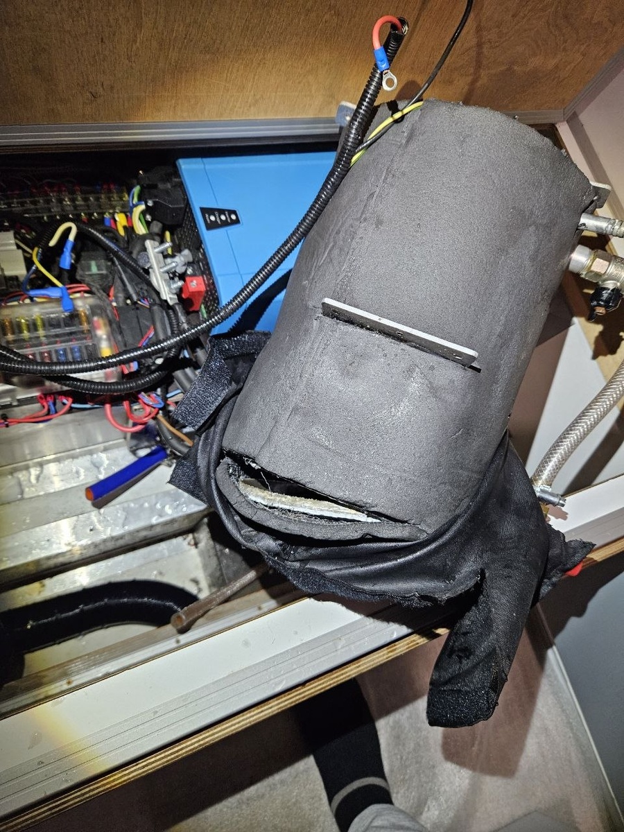 Тестировали береговое электричество и починенный инвертор и новый люк-вентилятор. И тут внезапно новый конкурс - лопнул бойлер. Весь рундук в воде. На ночь глядя полез разбирать все, искал маленькую дырочку, п нашел уехавшую крышу.... Как так получилось - не понимаю... Уже не первый год готовлю домик к зиме и всю воду сливаю, и вот... 🤷♂ Покой нам только снится.... Кстати, если интересно посмотреть, сколько грязи накапливается за год в бойлере - есть прекрасная возможность )