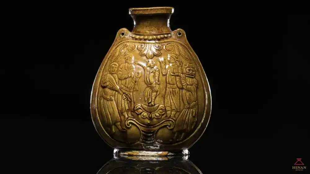 Желтый глазурованный плоский кувшин эпохи Северной Ци (550 – 577 гг.) из коллекции Хэнаньского музея — это культурное сокровище, хранящее память о Шелковом пути. Форма керамического изделия напоминает форму седельной сумки, которую носили кочевые народы верхом на лошадях, а обе стороны горшка украшены яркими узорами «Танца Хутэна»: танцоры прыгают и танцуют на лотосовых тронах, а музыканты по обе стороны играют на флейтах, тарелках и пипе. Эта сцена ярко воссоздает грандиозное зрелище экзотической музыки и танца, которые были популярны в районе Центральной равнины Китая более тысячи лет назад. Танец Хутэн зародился в центральноазиатском государстве Шаш (современный Узбекистан) и представляет собой сольный мужской танец, характеризующийся прыжками и скачками. В период Северных династий (386 – 581 гг.), с открытием Шелкового пути, этот страстный и безудержный танец, наряду с музыкальными инструментами, такими как пипа, был завезен в район Центральной равнины и быстро стал популярен при
