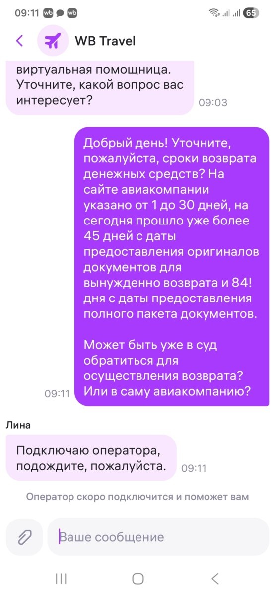 В конце декабря мы купили авиабилеты через wb тревел и должны были лететь на новый год в Сочи, но дочка заболела и пришлось всё отменить. Билеты невозвратные, естественно вызывали скорую, больничный лист и т.д., чтобы оформить вынужденный возврат по медицинским показаниям. Всё сразу согласовали, но потом начали тянуть, то оригиналы, то авиакомпания на запрсы не отвечает. Сегодня 1 апреля и после длинной петиции и предложением обратиться в суд нам наконец оформили возврат. 3 месяца! Что я хочу сказать: вернуть деньги возможно, но не пользуйтесь услугами вб для покупки авиабилетов.