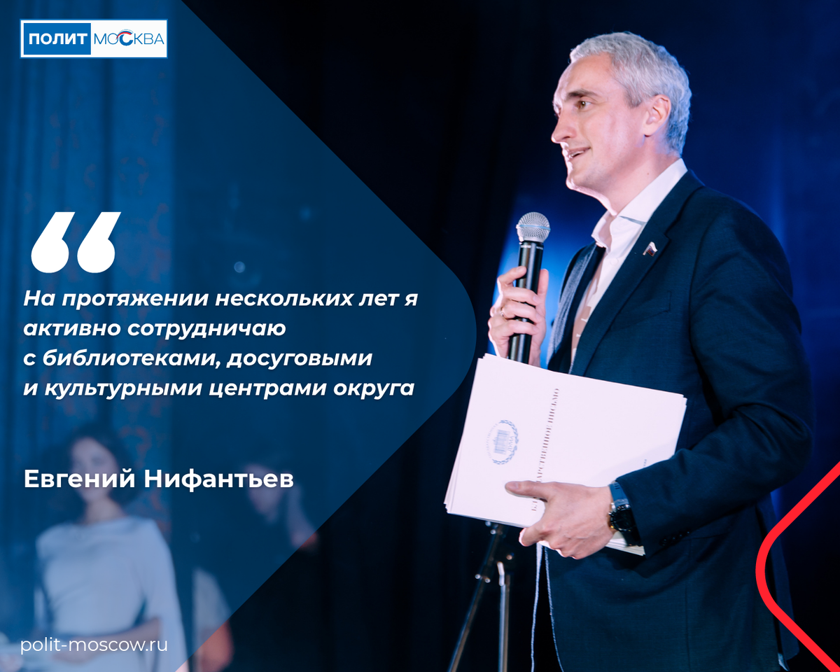На юге Москвы подвели итоги окружного конкурса «Вектор культуры» — участники собрались на торжественную церемонию награждения, которую дополнил праздничный концерт. В проекте, реализованном Объединением культурных и досуговых центров ЮАО, приняли участие творческие коллективы и специалисты девяти культурных центров и 32 библиотек. Премии лауреатам вручил депутат Госдумы Евгений Нифантьев. На протяжении нескольких лет я активно сотрудничаю с библиотеками, досуговыми и культурными центрами округа. Вижу, с какой энергией местные специалисты вовлекают людей любого возраста в жизнь сообщества. Во время концерта лично поблагодарил команду — настоящие профессионалы! Выступление получилось замечательным, впечатления самые теплые», — подчеркнул Нифантьев. В этом году конкурс включал более 20 номинаций, где были представлены творческие и социально-культурные проекты.
