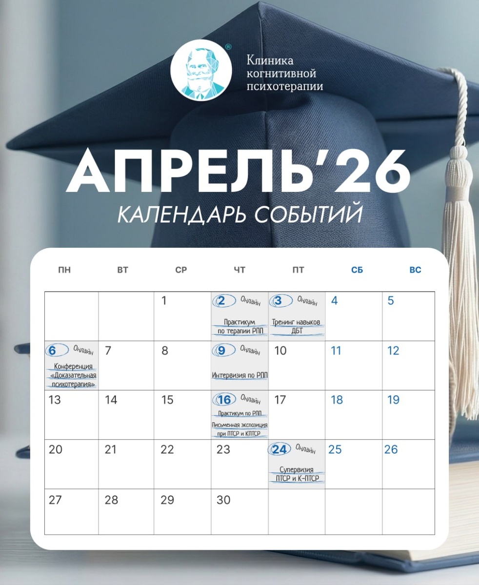 Коллеги, делимся анонсом образовательных программ CBT Clinic Education ⚡️ Напоминаем, что по окончании образовательных программ участники получат удостоверение о повышении квалификации установленного образца Ссылка для регистрации на интервизии/супервизии: cbtclinic.education/intervision Ссылка на группу ДБТ для клиентов: https://pavlov.cbtclinic.ru/dbt 🎓 Онлайн конференция "Доказательная психотерапия: новые исследования и современные направления" Приглашаем Вас принять участие в открытой конференции для специалистов 🗓 6 апреля 2026 г. Онлайн с 10.00 до 19.00 по МСК Подробнее https://cbtclinic.education/evidence-based-psychotherapy 🍩 Практикум по терапии РПП: от знаний к навыкам Навык: Круговая диаграмма самооценки (пирог самооценки) 2 апреля Онлайн с 10:00 до 13:00 по МСК Ведущий - клинический психолог Коротна М.Ю. Стоимость 4 000 р. Навык: Зеркальная экспозиция (экспозиция с образом тела) 16 апреля Онлайн с 15:00 до 18:00 по МСК Ведущий - медицинский психолог Аверкова Д.
