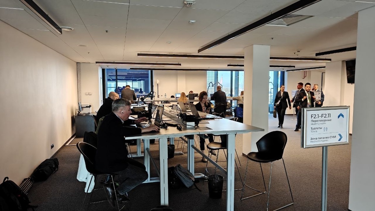 несмотря на относительно ранее время, в пресс-центре Международного Транспортно-логистического форума уже много работников пера.