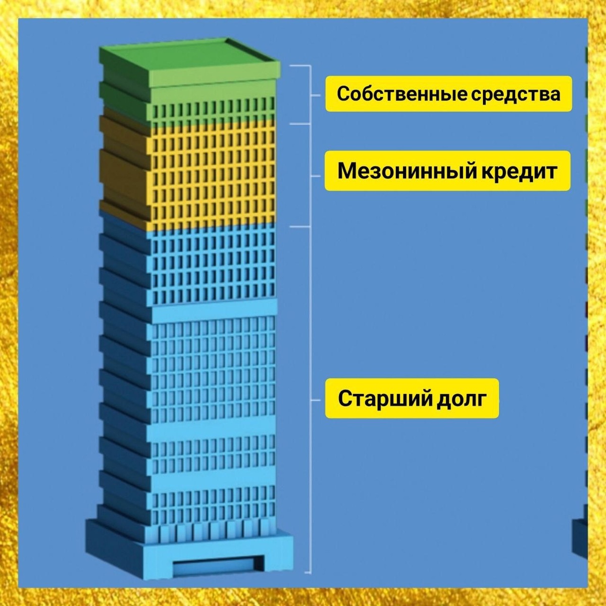 capital stack), он же «слоёный пирог финансирования»... 💡Представим, что частному инвестору предлагается принять участие в девелоперском проекте, предполагающем: ⛳ покупку земельного участка 🏗️ строительство коттеджа 💰 продажу домовладения 💸У инициатора проекта, который предлагает инвестору сотрудничество есть целых три варианта совместной работы: 1️⃣ «Дай кредит под залог участка и будущего дома»: это самый безопасный уровень для инвестора, потому что в случае чего инвестор имеет право первым получить свои денежки за счет продажи участка и дома (именуется старший долг). Но и доходность невысокая - немногим больше % ставки, которую взял бы банк. 2️⃣ «Дай в долг». Например, проект реализуется через ООО, инвестору предлагается выдать кредит инициатору под залог долей общества (мезонин). При этом земля и будущий дом всё равно будут обременены кредитом (банка или другого инвестора - иначе проект не реализовать). Тут рисков больше, потому что инвестор, выдавший мезонин, в случае ч
