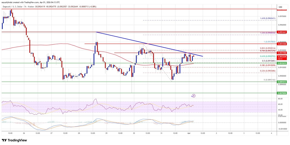 Dogecoin начал восстановление выше отметки $0.0915, но столкнулся с сопротивлением на уровне $0.0930. Медведи активно удерживают позиции, не давая цене закрепиться выше значимых уровней. Дальнейшее движение DOGE будет зависеть от преодоления ключевых сопротивлений или пробоя поддержек. 📊 Ключевые моменты: - Цена DOGE торгуется выше $0.0915 и 100-часовой SMA. - Медвежий трендлайн с сопротивлением на $0.0928 препятствует росту. - Основные сопротивления: $0.0928, $0.0930, $0.0950. Прорыв $0.0950 может привести к росту до $0.10. - Основные поддержки: $0.0915, $0.0900, $0.0885. Пробой $0.0885 может обвалить цену до $0.0860 или $0.0835. - MACD для DOGE/USD теряет бычий импульс, RSI выше 50.