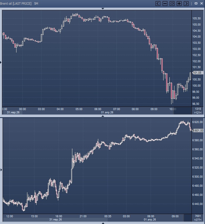 Всплеск оптимизма среди инвесторов случился после заявления Дональда Трампа о том, что США прекратят конфликт в Иране в течение «2–3 недель» График фьючерса на индекс S&P 500 и нефти марки Brent На фоне ожиданий скорого завершения конфликта в Иране, вызванного возможными действиями Дональда Трампа, мировые рынки проявили активность, а стоимость нефти снизилась до 100 долларов за баррель. В Европе индекс Stoxx 600 увеличился на 2 %, японский индекс Topix поднялся на 5 %, а южнокорейский Kospi вырос на 8 %. Американские фондовые индикаторы продолжили своё восходящее движение после рекордного дня за последние десять месяцев. Инвесторы рассчитывают на завершение иранской войны быстрее, чем предполагалось ранее. В среду стоимость нефти марки Brent упала более чем на 3 % и опустилась ниже 100 долларов за баррель по июньскому фьючерсу. В марте цена на нефть марки Brent выросла на 63 % и во вторник, в последний день майского контракта, достигла максимальной отметки с начала конфликта — 118,35