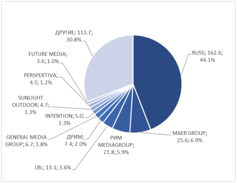 По оценке АКАР в 2025 г. на долю цифровых рекламоносителей приходился 77,1% от общего объема реализации в наружной рекламе, который по итогам года составил 90,4 млрд руб. Весь объем рынка рекламы вне дома (Out-of-home, ooh) достиг 109,1 млрд руб. Темп роста рынка ooh составил +12%, и несмотря на то, что он серьезно замедлился в сравнении с 2024 г. (+45%), наружная реклама оставалась одним из наиболее динамичных сегментов рекламного рынка, незначительно, но всё же опережая сегменты «Видео» (+10% в 20205 г.) и «Интернет-сервисы» (+9%). Весь рост объемов рынка наружн