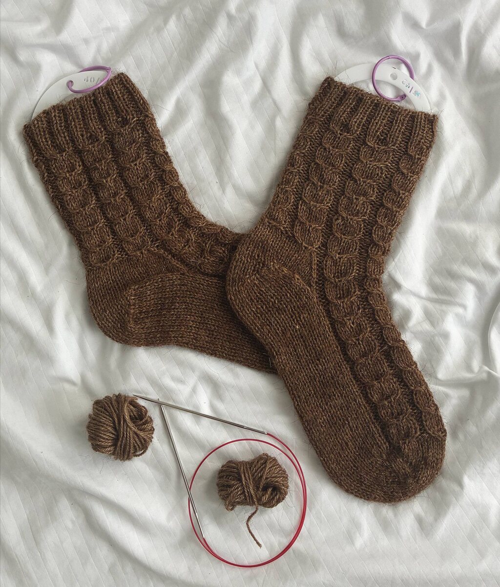 😋 Процесс ворвался незаметно, но пока были на больничном, что-то не хотелось ковырять плечевые. Пряжа Камтекс «Верблюжка», спицы 3 мм. На размер 42-44 ушло 90 г. Вязала от мыска, но уж надоел узор, хотелось поскорее закончить 😁 Остатки пущу на другую пару. Подробнее запилю видео обзор на эту пряжу и носки на ютуб и в ВК