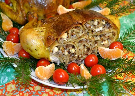 Курица, фаршированная блинчиками с грибами - очень вкусное и нарядное блюдо из курицы. Его чаще всего подают в качестве закуски, поэтому перед подачей его нужно охладить. Ингредиенты: Рецепт приготовления свернуть блинчик с начинкой трубочкой. Таким образом свернуть все блинчики с курицей и грибами. 8. Разложить куриную кожу, вложить внутрь блины с начинкой, 9. Стянуть куриную кожу, все отверстия зашить или сколоть зубочистками. Кожу проколоть в нескольких местах, чтобы она не лопнула при запекании. 10. Форму для запекания застелить фольгой, налить в фольгу немного воды. 11. Добавить в сметану соль, перец и смазать этой смесью фаршированную курицу. 12. Выложить ее на противень, смазать с другой стороны. 13. Отправить курицу в духовку, разогретую до 200 градусов и запекать в течение 50 минут. 14. Через 40 минут накрыть курицу фольгой. 15. Затем готовую фаршированную курицу достать из духовки, выложить на блюдо, убрать фольгу и зубочистки. 16. Разрезать курицу пополам и подать к с