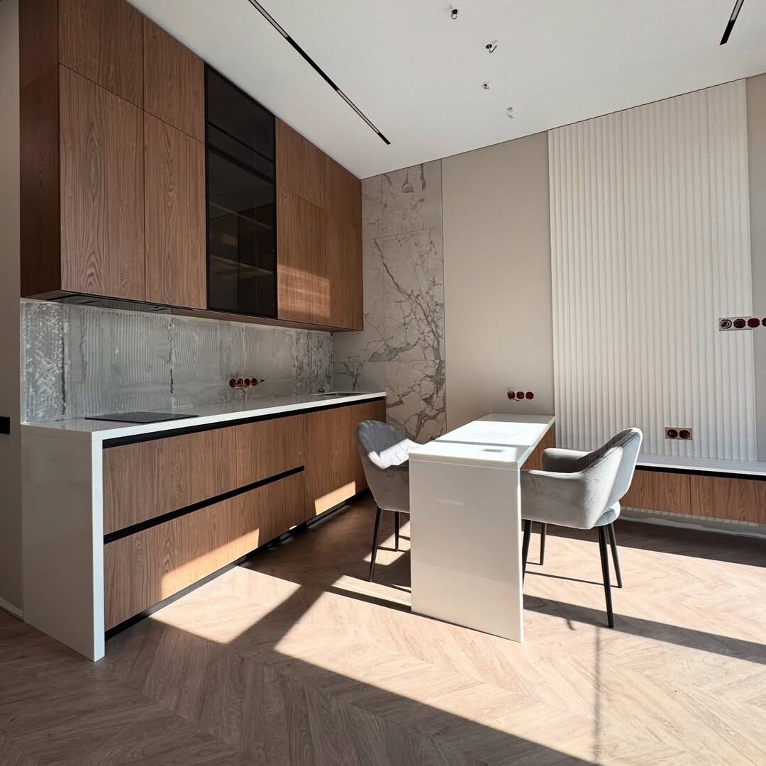 В этом проекте мы сделали ставку на сочетание натуральных текстур, лаконичных форм и премиальных материалов. Корпус кухни выполнен из надежного ЛДСП Egger, а фасады — в эффектном миксе МДФ Эмаль и МДФ в натуральном шпоне 🌿 Особое внимание уделили комфорту в ежедневном использовании: ✔️ фурнитура Blum — это плавность, надежность ✔️ столешница и барная стойка из акрилового камня — практичное и эстетичное решение Барная стойка стала не только функциональным элементом, но и важной частью композиции — она объединяет кухню и жилое пространство, делая интерьер еще более современным и удобным ☕️ Для нас дизайнерская кухня — это всегда больше, чем просто мебель. Это продуманное пространство для жизни, где важна каждая деталь, каждая фактура и каждое ощущение 🤍 Если вы тоже мечтаете о кухне, созданной именно под ваш интерьер и образ жизни — будем рады реализовать ваш проект ✨