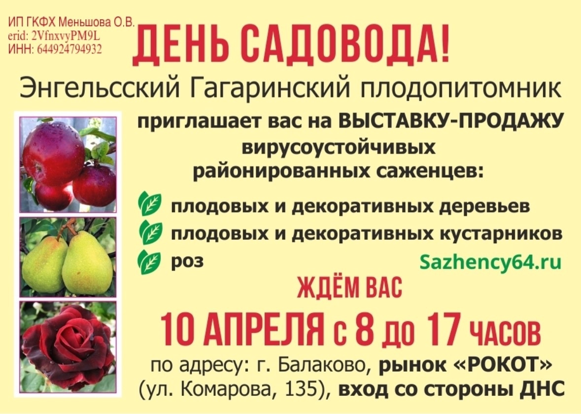День садовода! Энгельсский Гагаринский плодопитомник приглашает на выставку-продажу 10 апреля.Реклама: ГКФХ Меньшова Олеся Владимировна ИНН 644924794932 erid: 2VfnxvyPM9L