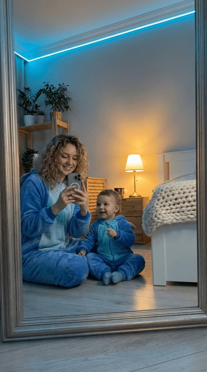 Сгенерировать фото⚡️ Перейти в бота 🤖 Используй лица женщины и ребенка с загруженнных фото. Фотореалистичная сцена в уютной спальне. На светлом деревянном полу перед большим напольным зеркалом сидят молодая женщина и маленький ребёнок. На них одинаковые плюшевые пижамы-кигуруми синего цвета в стиле персонажа Стич — мягкая фактура ткани, капюшоны с ушками. У женщины тёмные кудрявые волосы, рассыпанные по плечам. Она держит смартфон и делает селфи, глядя в экран. Ребёнок сидит рядом, повернувшись к зеркалу, счастливо улыбается, глядя на своё отражение. Обстановка спальни: белая кровать с пушистым пледом, прикроватная тумбочка с тёплой настольной лампой, комнатные растения в кашпо. По потолку проходит тонкая синяя LED-подсветка, создающая мягкое контровое свечение. Освещение смешанное: тёплый свет от лампы и холодный от LED-ленты формируют мягкие кинематографичные контрасты. Мягкий свет подчёркивает текстуру плюша, натуральность кожи, блеск экрана смартфона и отражения в зеркале. Высоко
