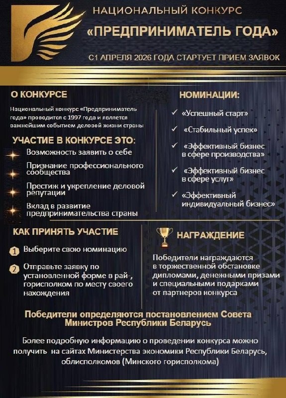 » 🔝🏆Участие в конкурсе – это отличная возможность заявить о своем бизнесе, а победа в нём – подтвердить деловому сообществу профессионализм своей команды! ‼️Заявки для участия принимаются с 1 апреля до 1 июня 2026 г. по месту нахождения субъекта хозяйствования. ➡️Подробнее о проведении конкурса можно узнать сайте.