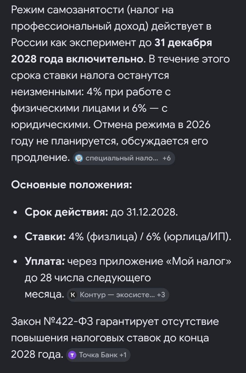 А дальше посмотрим... Режим самозанятости (налог на профессиональный доход) действует в России как эксперимент до 31 декабря 2028 года включительно. В течение этого срока ставки налога останутся неизменными: 4% при работе с физическими лицами и 6% — с юридическими. Отмена режима в 2026 году не планируется, обсуждается его продление. Основные положения: - Срок действия: до 31.12.2028. - Ставки: 4% (физлица) / 6% (юрлица/ИП). - Уплата: через приложение «Мой налог» до 28 числа следующего месяца. Закон №422-ФЗ гарантирует отсутствие повышения налоговых ставок до конца 2028 года.