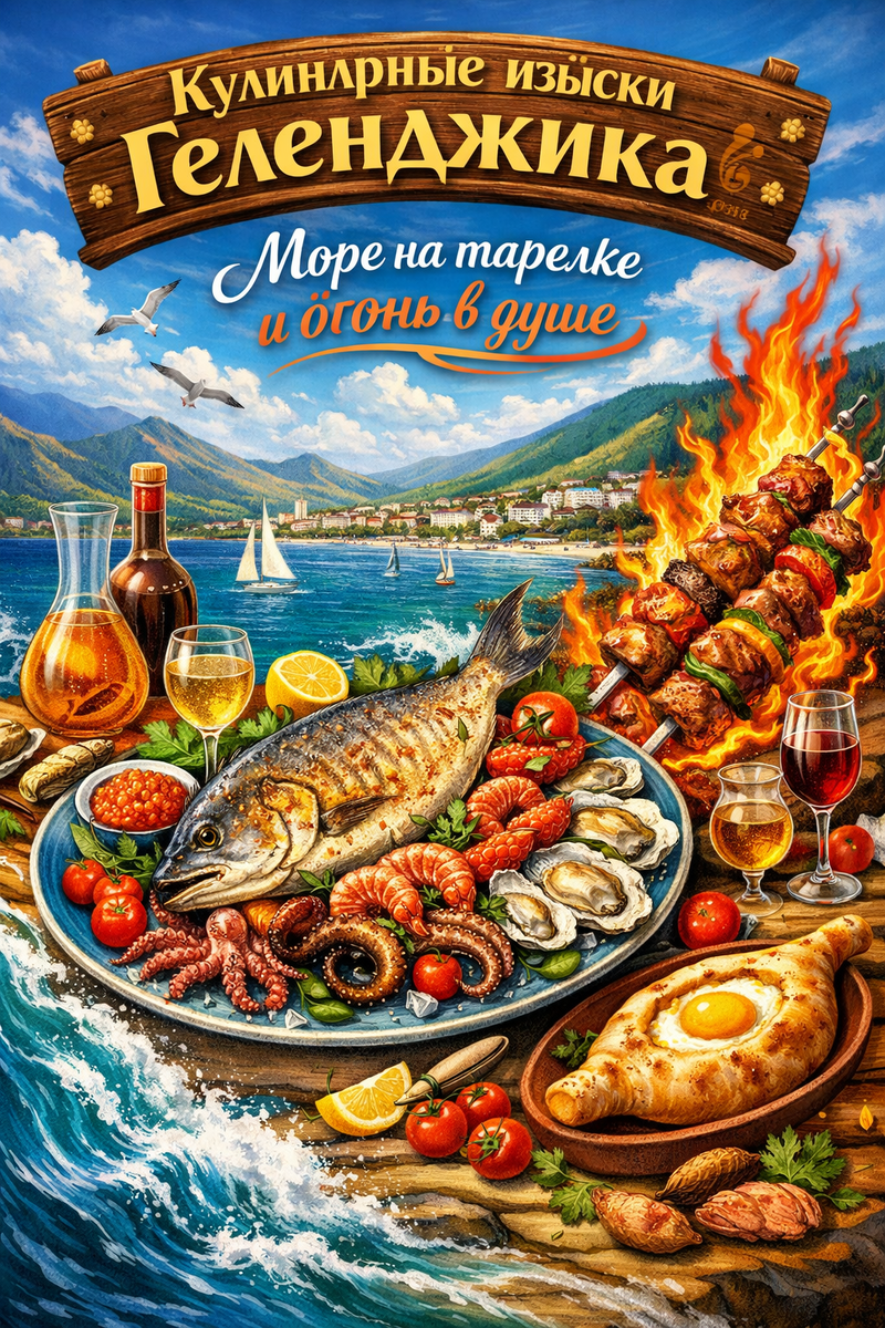 Геленджик — это не только знаменитая бухта-подкова и горные виды, но и настоящий гастрономический рай на берегу Чёрного моря. Здесь кухня складывается из трёх ярких элементов: **свежайших морепродуктов** прямо из моря, **кавказских традиций** с мангалом и шашлыком, а также сочных южных овощей и фруктов с местных рынков. Получается гармоничный микс — от лёгких средиземноморских акцентов до сытных мясных блюд на огне.