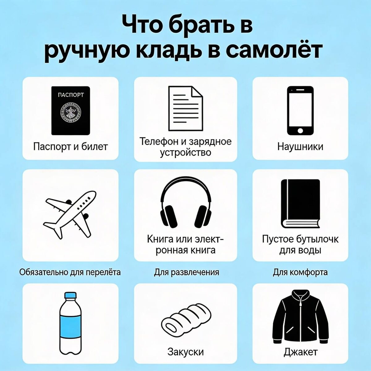 Ваш идеальный набор для комфортного перелёта — это вещи, которые спасут от задержек багажа и сделают полёт приятным. Собирайте рюкзак или сумку по правилам авиакомпаний: до 10 кг, габариты 55×40×25 см, плюс личные мелочи. Вот must-have для туристов. Документы и ценности Паспорт, билеты, виза и деньги всегда в салоне — багаж теряется, а вы улетаете без проблем. Добавьте зарядку для телефона и power bank (до 100 Вт·ч). Лекарства в оригинальной упаковке с рецептом, если нужно. Еда и питьё Возьмите снеки: орехи, фрукты, батончики — без жидкостей и острого. Пустую бутылку для воды долейте после контроля; детское питание свыше 100 мл разрешено. Жвачка или леденцы спасут уши от закладывания. Уход и комфорт Компрессионные чулки против отёков, увлажняющий крем, капли для глаз — салон сушит кожу. Маска для сна, беруши, дорожная подушка и лёгкий плед для отдыха. Сменная футболка и бельё на всякий случай. Личные вещи Верхняя одежда, костюм в портпледе, дамская сумка или рюкзак 36×30×12 см про