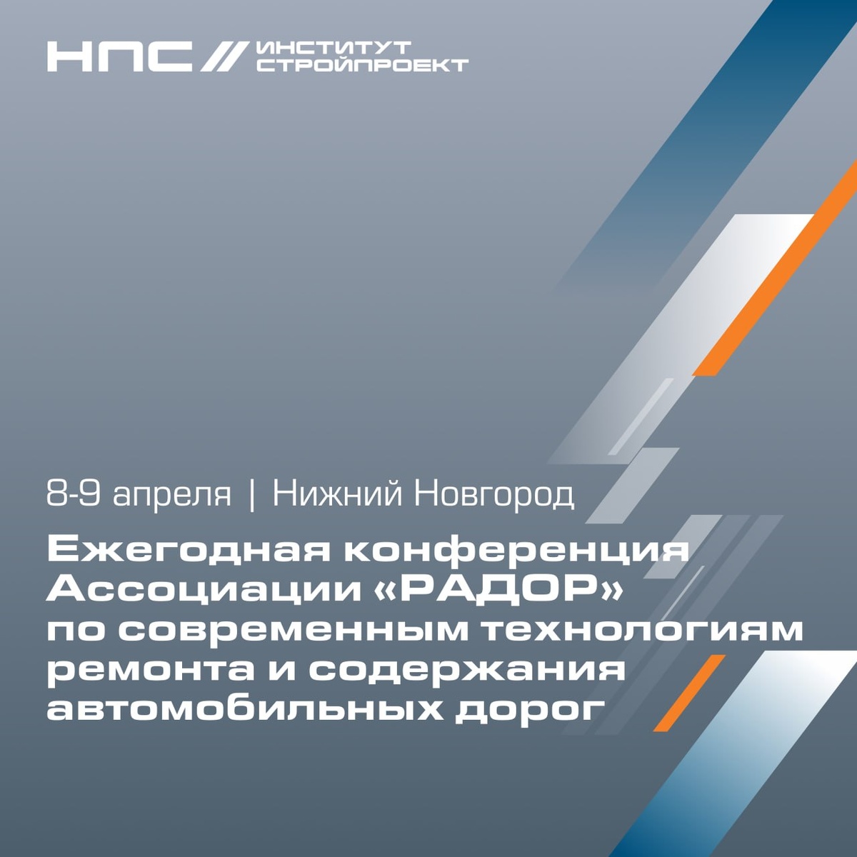 » Конференция пройдёт в Нижнем Новгороде 8-9 апреля. От Института «Стройпроект» (входит в Нацпроектстрой) выступит Александр Кусик, первый заместитель генерального директора. Он расскажет об актуальных вопросах проектирования автомобильный дорог с точки зрения проектировщика. Также в программе конференции: несколько сессий, посвящённых разным этапам жизненного цикла дорог, включая проектирование, ремонт и содержание. Другие вопросы для обсуждения — безопасность дорожного движения, применение новых материалов для строительства и ремонта, экономика проектирования и содержания автодорог, совершенствование нормативной базы и пр. В программе конференции предусмотрена экскурсия на строительную площадку Дублёра проспекта Гагарина — крупный инфраструктурный объект Нижнего Новгорода, в котором участвует и Стройпроект. Конференция проводится при поддержке Правительства Нижегородской области. В конференции участвуют представители Министерства транспорта РФ, Росавтодора, подрядных, проектных,