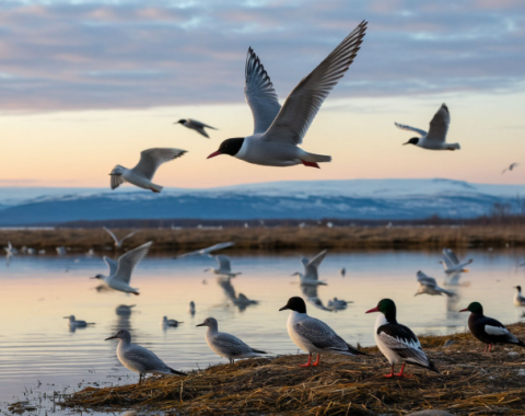 Сегодня, 1 апреля, мир отмечает Международный день птиц. В Мурманской области этот праздник совпал с началом активной миграции пернатых: гости с юга уже появились в Териберке и в Кольском заливе, возвещая о пробуждении Арктики. Первыми в регион прилетают полярные крачки — изысканные мигранты, преодолевающие до 20 тысяч километров из Антарктиды. В этом году теплая погода ускорила миграцию: крачек можно увидеть в Териберке. Они появились в Кольском заливе в конце марта, устраивая гнездовья на скалах. С начала апреля в тундре можно будет услышать протяжные крики гагар — символов севера. Эти крупные птицы с ярко-красными клювами гнездятся у озер и рек, становясь первыми «певцами» весны. Среди других пионеров — гуси (серые и белолобые), которые стаями слетаются на болота, а также утки (нырки, красноголовые чернети), массово прибывающие к середине апреля. А на мурманских сопках радостно звучат трели сосновых синиц и полевых жаворонков, провозглашающих конец зимы. Фото: нейросеть