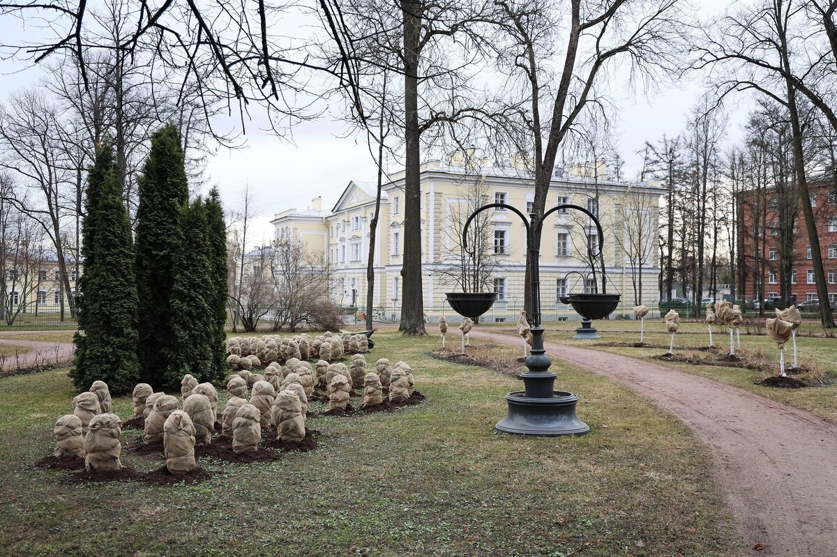 По всему городу в садово-парковых хозяйствах идут работы по снятию укрытий с посадок. На днях торфяной плед убрали с растений в саду у Дачи Кочубея в Пушкине, сообщили сегодня в пресс-службе вице-губернатора Петербурга Евгения Разумишкина. «Все эти теплые «одежды» нужны для того, чтобы посадки комфортно перенесли холодный сезон, – говорится в сообщении. – И самшит, и гортензия были размещены в Пушкине после того, как отстояли в кадках целый сезон в саду-трансформере на Синем Мосту у Исаакиевского собора». Ранее «Петербургский дневник» сообщал, что в Петербурге на Исаакиевской площади вновь откроется сад-трансформер.