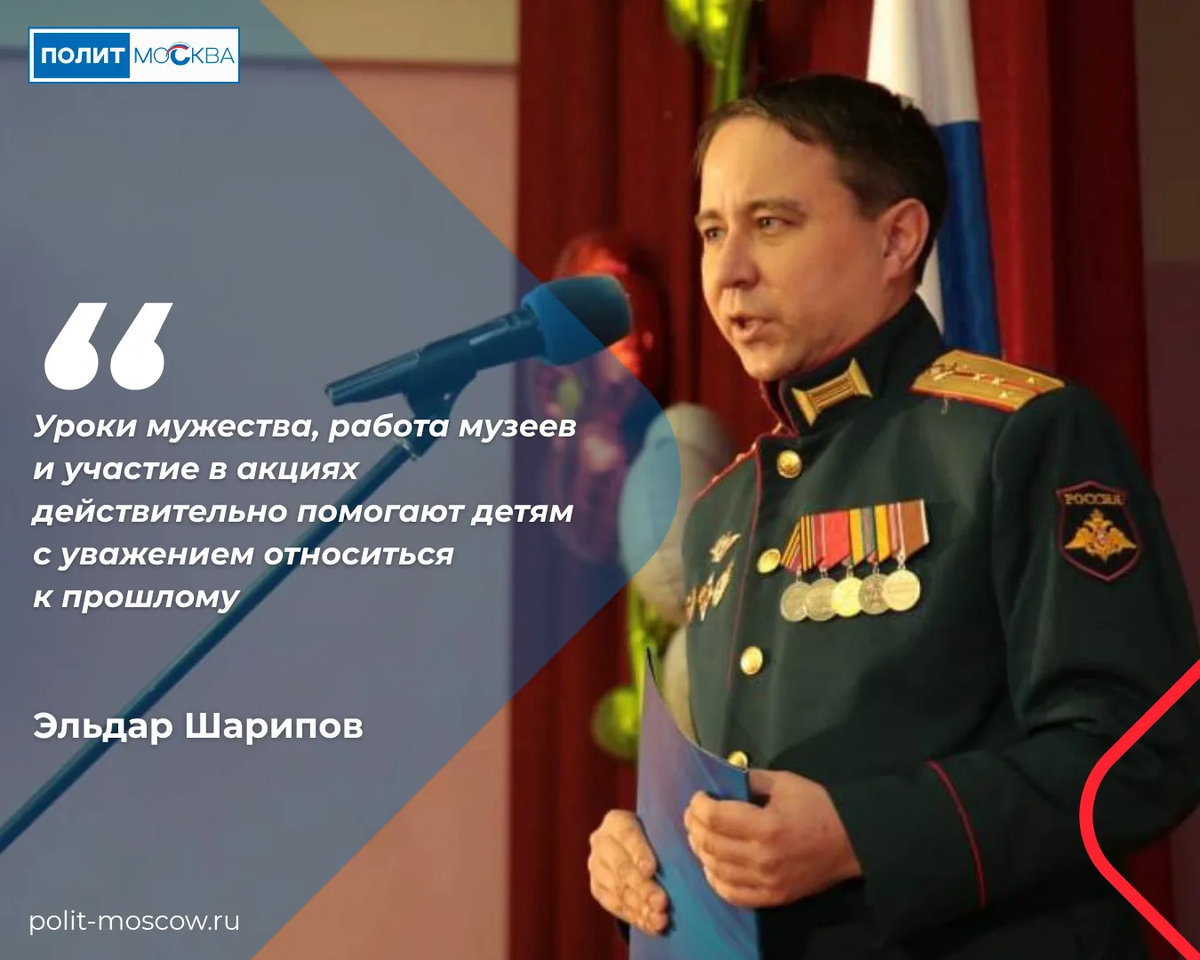 В школе № 2100 рядом учатся и растут и самые маленькие дошколята, и старшеклассники, а в коридорах сразу ощущается тёплая, почти домашняя атмосфера. Особая гордость коллектива — музей «Истоки», посвящённый Великой Отечественной войне, и музей героев СВО: это живое пространство памяти, где ребята видят, как подвиг фронтовиков и мужество современных защитников складываются в единую историю страны. В гости к школьникам пришёл участник СВО Эльдар Шарипов. В беседе с педагогами он рассказал о службе и общественной деятельности, ответил на их вопросы; откровенный и содержательный разговор стал серьёзной опорой для учителей в их патриотической работе. В финале встречи Эльдар Шарипов вручил педагогам грамоты за вклад в развитие патриотического воспитания и волонтёрских инициатив. «Для коллектива это не просто знак признания, а подтверждение того, что уроки мужества, работа музеев и участие в акциях действительно помогают детям с уважением относиться к прошлому и ответственнее смотреть в будуще