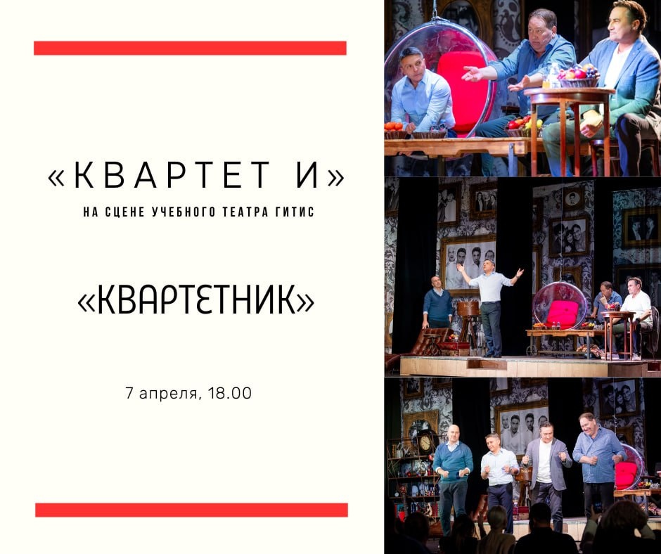 👆👆👆 7 апреля на сцену Учебного театра ГИТИС выйдет «Квартет И». Их «Квартетник» станет частью фестиваля «110 лет в подвале небоскрёба», посвящённого истории театрального пространства в Доме Нирнзее, где уже больше века существует учебная сцена института. Фестиваль собирает театры, творческие коллективы и проекты, которые выросли из гитисовской среды. Среди них — «Квартет И», созданный выпускниками института Леонидом Барацем, Ростиславом Хаитом, Камилем Лариным, Александром Демидовым и Сергеем Петрейковым. «Квартетник» вырос из дружеских встреч — тех разговоров, когда за одним столом спорят о фильмах, читают стихи, поют песни и неожиданно переходят от анекдотов к личным воспоминаниям. Определить жанр этого вечера сами авторы до конца не берутся. «Квартетник» соединяет элементы квартирника, разговора со зрителем, музыкального концерта и стендапа. По словам участников, на репетиции ушло меньше времени, чем на обсуждение того, можно ли вообще назвать происходящее спектаклем. И каждый