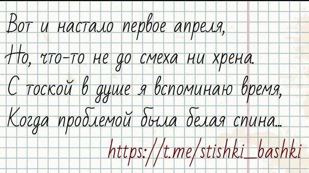 #первоеапреля #никомуневерю #стишкиизбашки Стишок каждый день для настроения @stishki_bashki 📹 - видеостишки тут 👈 🙊 - а тут можно комментировать 👈 Поделитесь стишком с друзьями