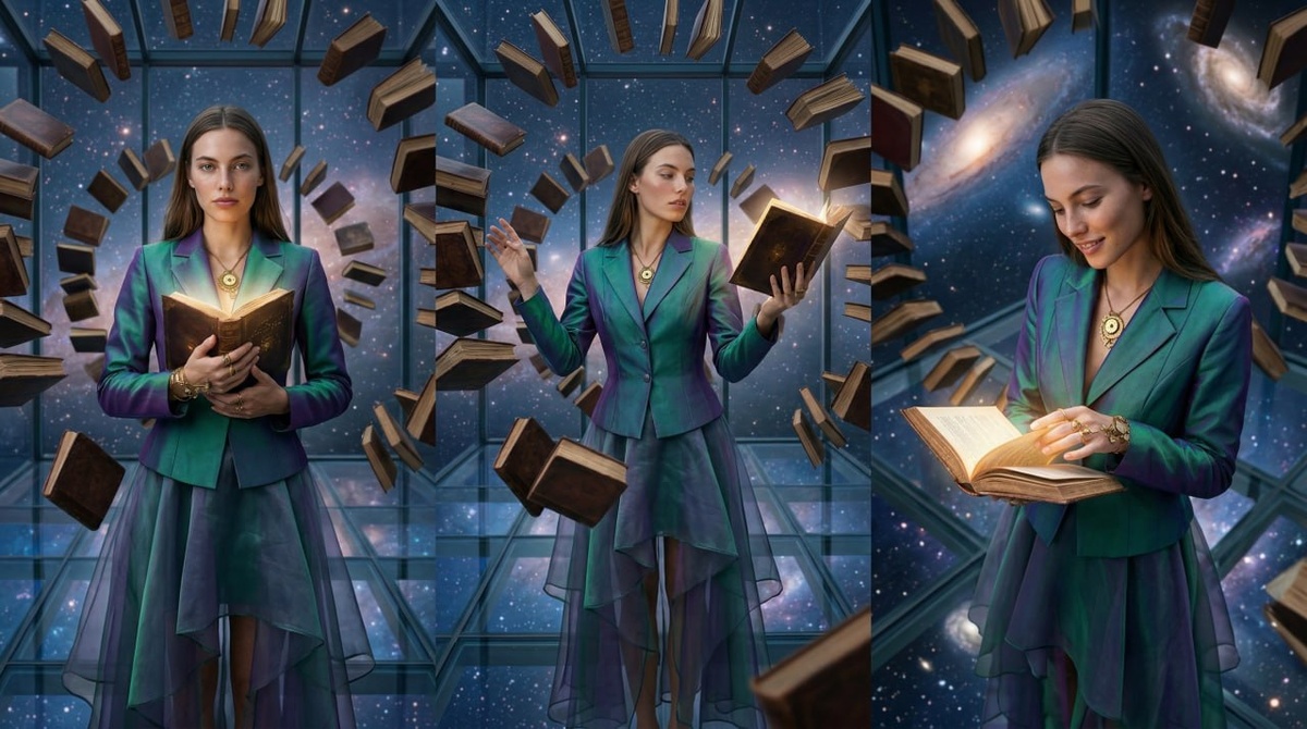 🧠 Prompt: SAVE FACIAL FEATURES FROM THE REFERENCE PHOTO: In the cloud-drenched Glass Library, where the walls and floors are made of perfectly clear glass, an endless starry sky stretches out, nebulae and shimmering galaxies receding beneath and around us. At the center of the stage stands the elegant and enigmatic woman from the uploaded photograph, with expressive, intelligent features and her hair casually pulled back into a loose bun. Her pose is calm and confident: she stands at full height, surrounded by thousands of ancient leather-bound books that float and slowly rotate in complex spirals around her, creating the sensation of a magical vortex of knowledge. She wears an architectural, avant-garde outfit: a structured jacket of iridescent fabric shifting hues from emerald to violet, and an asymmetrical cape-skirt of multi-layered sheer organza. The accent is on intricate gold and brass jewelry, crafted like intertwined clockwork mechanisms, hinting at her role as a keeper of ti