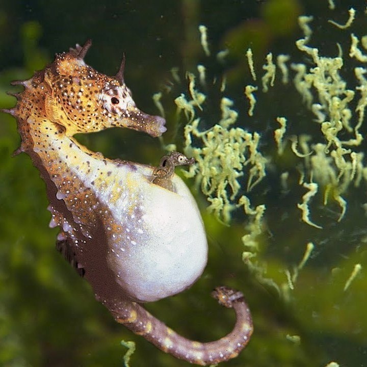 ? Потомство морских коньков вынашивает самец, а не самка. На теле самца есть специальный карман, куда самка вбрасывает яйца. Эта выводковая камера обильно снабжается кровью и полезными веществами, а также защищает икринки от негативных воздействий внешней среды. Википедия / Морские коньки https://ru.wikipedia.org/wiki/Морские_коньки