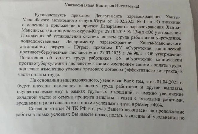Виктория работает в КУ «Сургутский клинический противотуберкулезный диспансер» санитаркой с 2015 года. По словам девушки, с 1 апреля 2025 года руководство отменило Виктории надбавку за вредные условия труда (класс 3.2). Девушка лишилась доплаты в 40%.