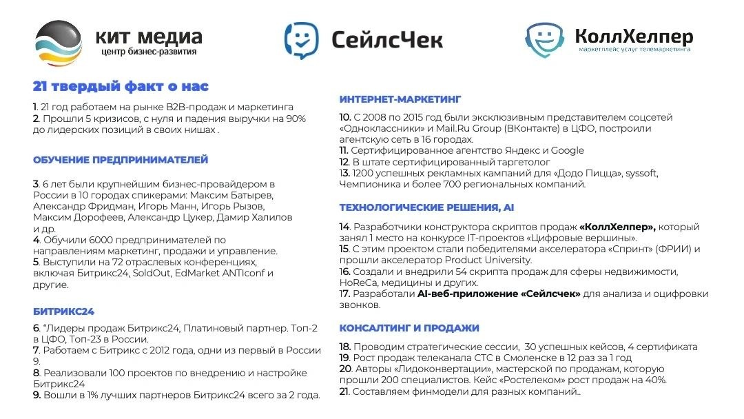 Кто мы и зачем вам этот канал. КИТ МЕДИА - ваш персональный эксперт по ИИ-развитию продаж на базе связки «СейлсЧек» + Битрикс24. За 23 года в бизнесе мы вывели простую формулу: ✅ Есть система и дисциплина → Есть рост продаж. ❌ Нет системы → Есть хаос, зависимость от «звезд» и выгорание собственника. Любую систему можно спроектировать, настроить, автоматизировать и масштабировать. Без поиска идеальных продавцов годами и без вашего участия в операционке 24/7. 📎 В карточке 21 факт о нас, которые доказывают: мы сапожники с сапогами. Этот канал - ваш навигатор для построения устойчивой машины продаж. Здесь будет только практика: 🔹 Реальные кейсы внедрения. 🔹 Эфиры с разборами. 🔹 ИИ-инструменты, которые помогают расти +50% ежегодно. Присоединяйтесь к тем, кто выбирает систему вместо хаоса! 🤖 Попробуйте «СейлсЧек» бесплатно уже сегодня https://salescheck.pro/ Мы в MAX