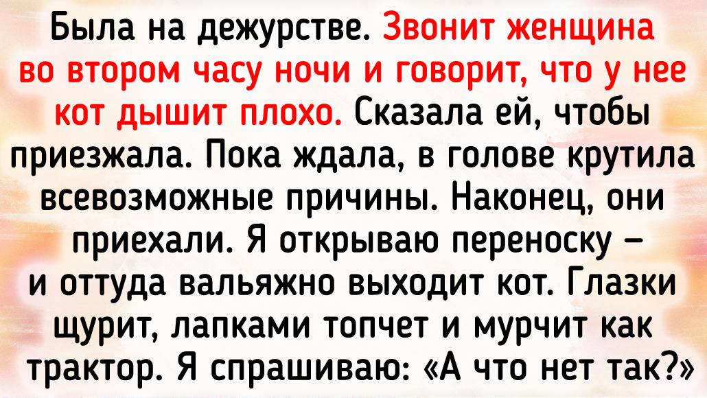 Была на дежурстве. Звонит женщина во втором часу ночи и говорит, что у нее кот дышит плохо. Сказала ей, чтобы приезжала. Пока ждала, в голове крутила всевозможные причины. Наконец, они приехали. Я открываю переноску — и оттуда вальяжно выходит кот. Глазки щурит, лапками топчет и мурчит как трактор. Я спрашиваю: «А что нет так?» Хозяйка говорит: «Ну, вот дышит так уже два часа!» Я кота покрутила и попыталась послушать, потом стала задавать уточняющие вопросы.
