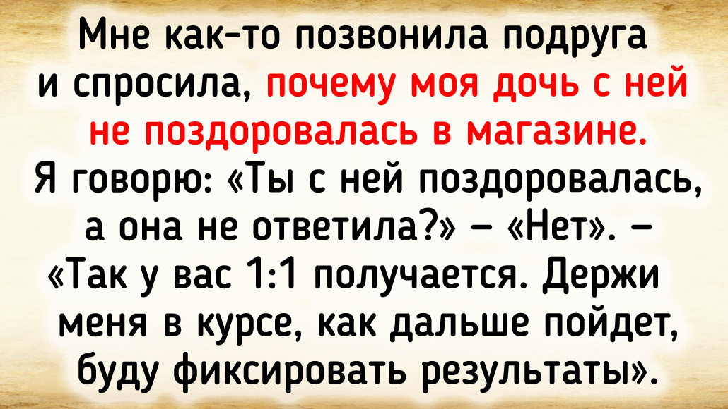 Мне как-то позвонила подруга и спросила, почему моя дочь с ней не поздоровалась в магазине. Я говорю: «Ты с ней поздоровалась, а она не ответила?» — «Нет». — «Так у вас 1:1 получается. Держи меня в курсе, как дальше пойдет, буду фиксировать результаты». © mariia__kubrak