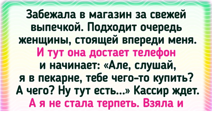 - У нас в поселке есть магазин-пекарня. Выпечка разная и вкусная. Всегда есть очередь в несколько человек. Как-то раз я забежала в магазин за свежей выпечкой. Подходит очередь женщины, стоящей впереди меня. И тут она достает телефон и начинает: «Але, слушай, я в пекарне, тебе чего-то купить? А чего? Ну тут есть...» Кассир ждет. А я не стала терпеть. Взяла и обошла женщину, чтобы сказать кассиру, что мне нужно. Вот не понимаю, неужели заранее позвонить нельзя было? © Fishe4ca