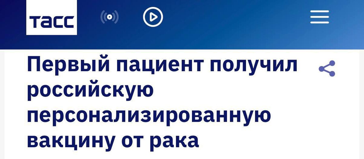 🔴 Первый пациент уже получил российскую вакцину от рака — им стал 60-летний россиянин с меланомой кожи, сообщили в Минздраве