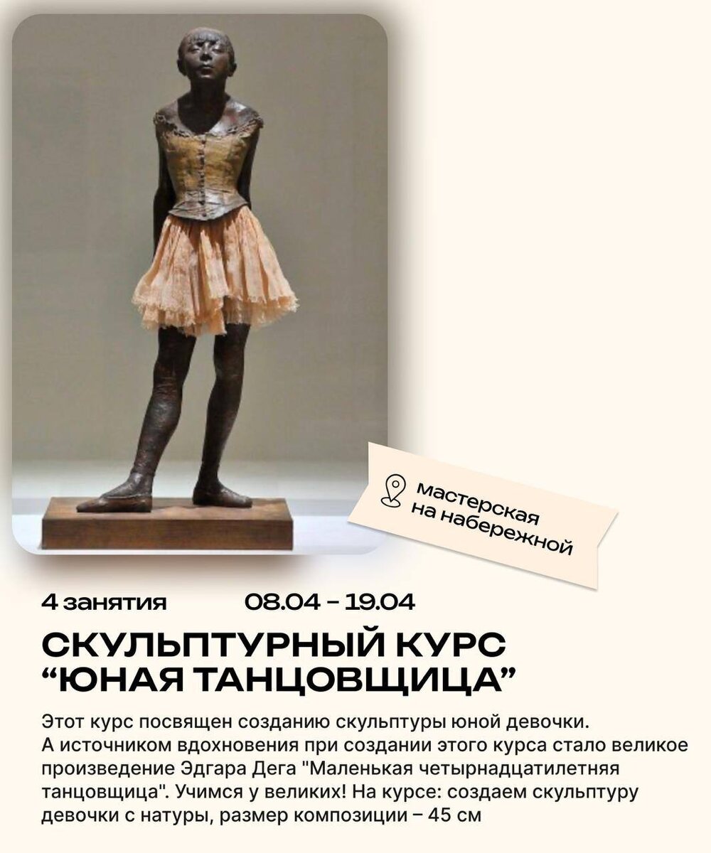 ! 🤌🏼 Наш новый курс посвящен созданию скульптуры юной девочки. Скульптурный курс «Юная танцовщица 08.04 18:45-21:45 12.04 12:00-15:00 15.04 18:45-21:45 19.04 12:00-15:00 Материал курса: скульптурный пластилин