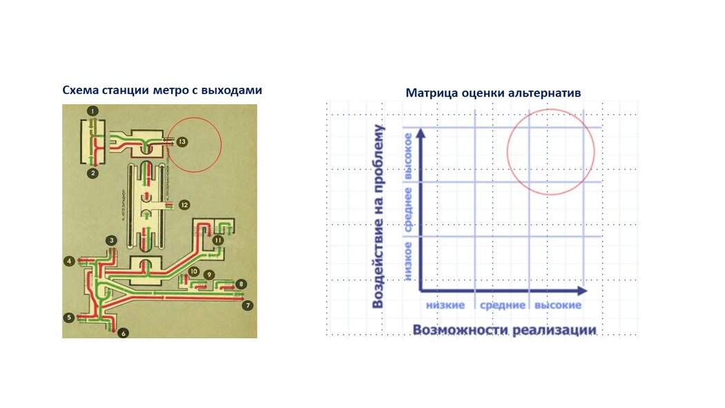Схема станции метро с нумерацией, многочисленных выходов напомнила мне «Матрицу оценки альтернатив». Существует достаточно много вариантов матриц, которые используют люди для принятия решения и оценки возможных вариантов и каждый находит для себя удобный рабочий инструмент. Я в работе и жизни уже на протяжении многих лет использую «Матрицу оценки альтернатив» Матрица - аналитический помощник, позволяющий систематически оценивать и сравнивать несколько вариантов решения по заданным критериям. Основная идея - оценить каждое альтернативное решение по определённым параметрами и выбрать наиболее подходящий вариант. Теперь представьте, что есть проблемная ситуация, которая требует решения и вы в индивидуальном м, либо коллегиальном формате начинаете искать различные варианты. Что дальше? А дальше необходимо проанализировать возможности, которые у вас есть и посмотреть насколько, предлагаемое решение будет воздействовать на проблему. И так первое с чего начинаются действия по устранению пробл