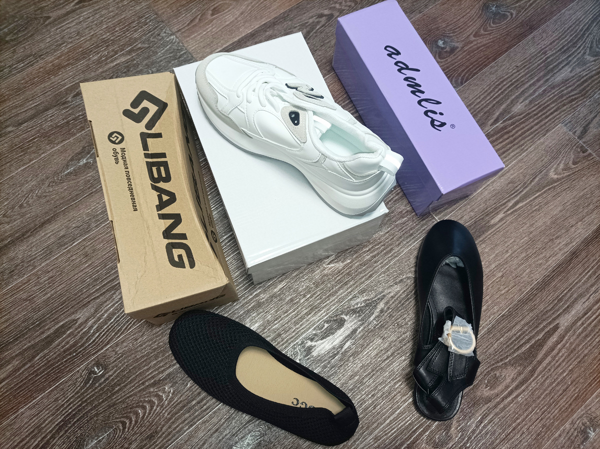 В этот раз я заказала кроссовки - они стоили около 1000. Чёрные тапочки и чёрные туфли - обе пары вышли порядка 1100 рублей.
