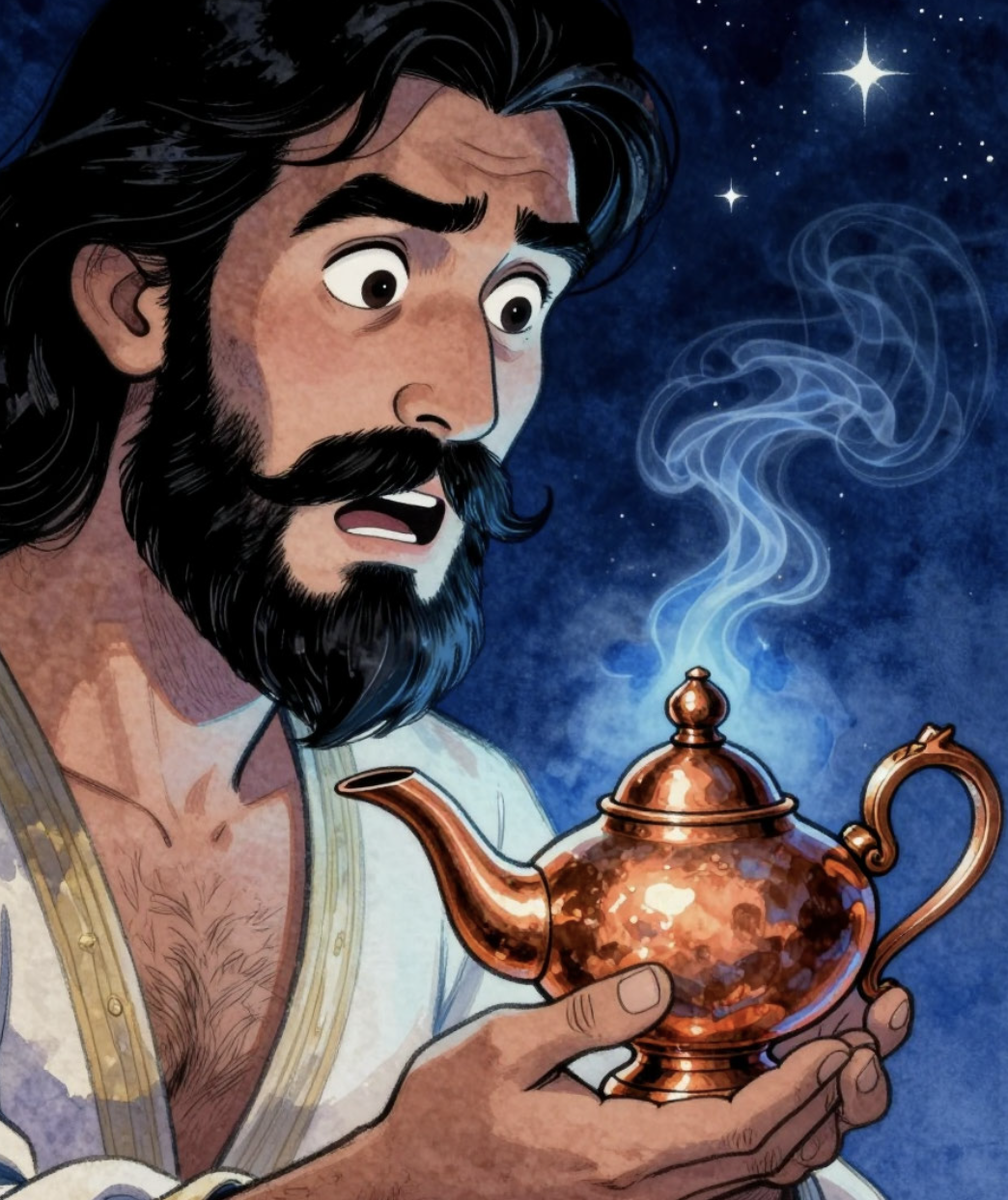 Из отверстия в лампе, куда обычно наливают масло, потёк синеватый дым, и в нём проступила фигура в чалме. Черты лица виднелись смутно, только ярко горели глаза.