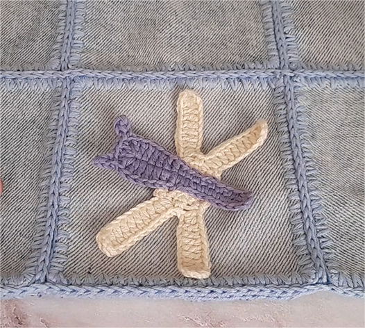 Я всех рада приветствовать на своем канале. Спасибо, что нашли время и заглянули. Вы на канале "Вяжу опять и снова. Вязаномания" Я продолжаю рассказывать о том, какие аппликации я вяжу для своей джинсовой сумки-переделки. Вяжу я их из 100 % хлопка, благо есть разные разноцветные остатки. Мне кажется, что именно хлопок как нельзя кстати походит для аппликаций: пряжа держит хорошо форму, вяжется из нее легко, а какая богатая цветовая гамма у хлопка и чаще всего это натуральные цвета. Одна из аппликаций на моей сумке - стрекоза. И эффектно, и вяжется просто. Стрекоза состоит из двух деталей: крылышек и туловища, они вяжутся по отдельности, потом сшиваются. Для стрекозы я использовала два цвета: для крылышек мне пригодилась пряжа молочного цвета, для туловища я выбрала сиреневый. В любом случае вы можете выбрать цвет пряжи на свой вкус. Для вас ниже размещаю подробное описания вязания ряд за рядом. Условные сокращенные обозначения: в.п.- воздушная петля сбн - столбик без накида пстб - полу