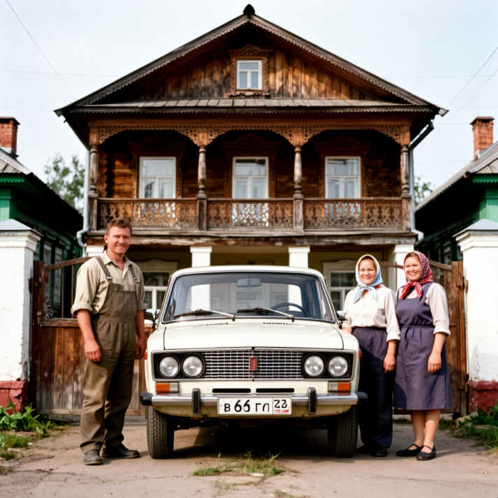 Русская деревня. Классический дом 1960-х годов. Возле дома стоит ВАЗ 2106 с советскими номерными знаками. Рядом – улыбающийся мужчина в рабочей одежде. Возле ворот стоит женщина в платочке и улыбается.