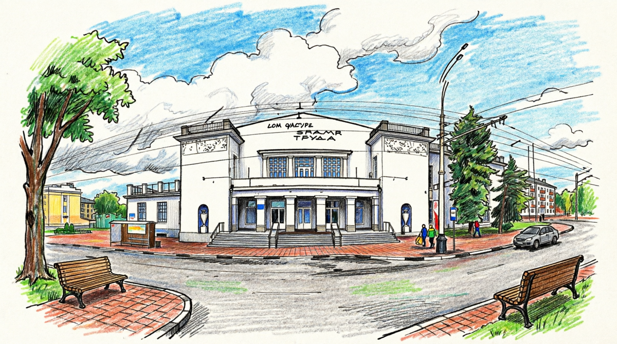 Официально — ДК «Знамя труда». Громадина 1929 года, стиль — советский авангард. Архитектор Свирчевский, видимо, вдохновлялся не столько искусством, сколько чертежами космических кораблей или, быть может, тюремных замков. Фасад украшают барельефы пролетариев. Они смотрят на тебя с такой суровой безнадегой, словно знают, что вместо светлого будущего ты сейчас пойдешь искать, где тут продают сувениры. Здание массивное, давящее, задает тон всей прогулке: мол, расслабляться рано, гражданин путешественник.