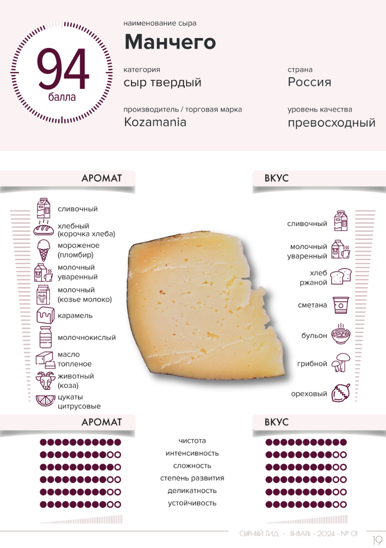 Весна в самом разгаре, хочется простых и понятных блюд. В этой статье познакомимся с твердыми сырами, которые отлично раскрывают свой вкус и аромат в составе холодных блюд и сырной тарелки, добавляя им пикантность и гастрономическую глубину. Аромат сыра интенсивный, сложный, развитый, деликатный. Вкус нежный, еле сладкий, с отличной кислотностью, солоноватый, с выраженной сливочной жирностью и выраженным умами. Вкус отлично сбалансирован, полный. Ярко выраженная ароматика и отличный баланс во вкусе. Сыр прекрасно дополнит сырную тарелку и подойдет для салатов и холодных блюд. Аромат сыра чистый, умеренной интенсивности, в аромате выделяются молочный, сливочный, цветочный тона с дополнением ореховым, хлебным (корочка хлеба), молочным уваренным и легким ментольным нюансами. Вкус сыра чистый, умеренной интенсивности, достаточно развитый. хороший образец выдержанного сыра. Подойдет и для сырной тарелки, и для холодных блюд, овощных салатов. Аромат сыра чистый, очень сложный, деликатный,