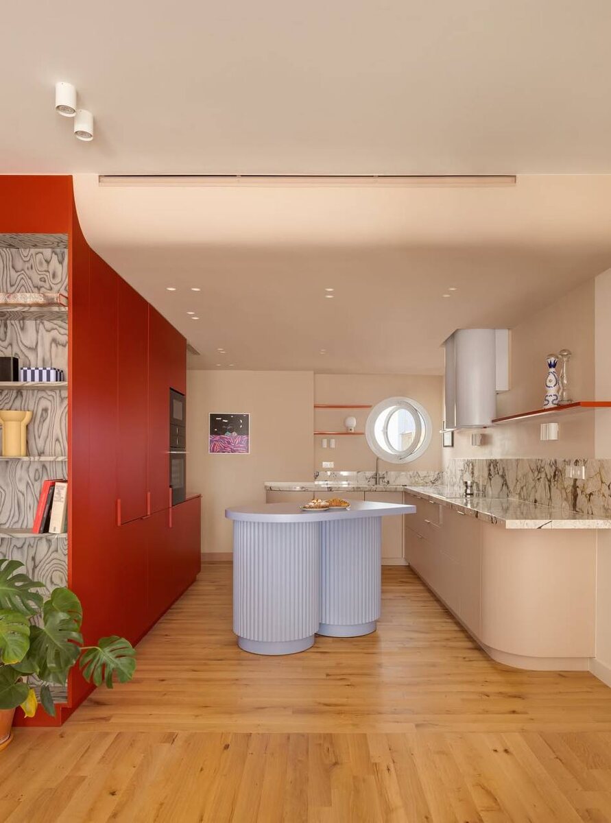 ? Иногда весь интерьер держится на одном акценте — и здесь это кухонный полуостров. Мягкий голубой оттенок сразу притягивает взгляд, добавляет свежести и делает пространство более «живым». Островная зона оформлена гибкой стеновой панелью Orac — за счёт этого поверхность выглядит объёмной, фактурной и по-настоящему дизайнерской. Такой приём добавляет интерьеру глубины и аккуратно выделяет функциональную зону, не перегружая пространство. Сохраняйте этот пост, чтобы не потерять идею для своего интерьера 🤍