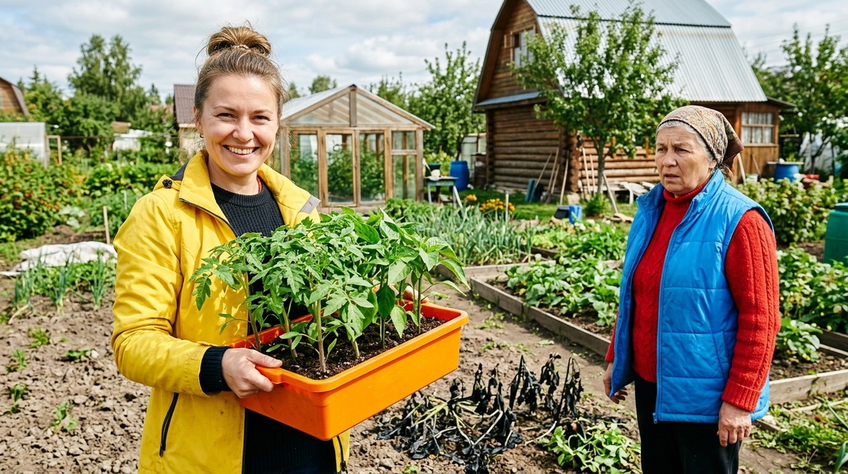 Участок выглядел так, будто его облили кипятком. Всё, что Зинаида Павловна высадила по своей «проверенной» схеме — помидоры, перцы, баклажаны, кабачки — лежало чёрной кашей. Двадцатилетний опыт и «Калифорнийское чудо» не пережили одну ночь. Проверенные сорта оказались ровно такими же смертными, как «сорные».