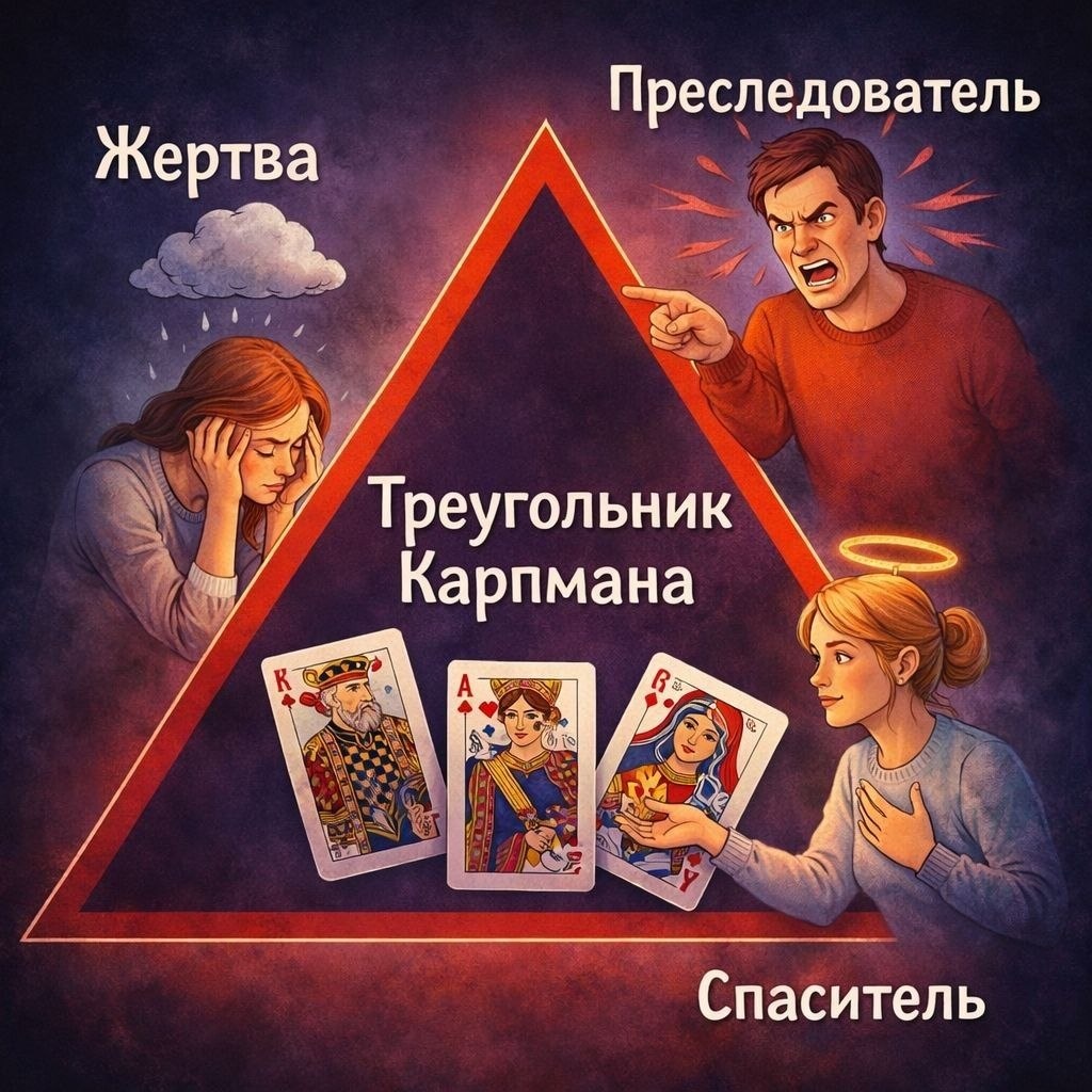 Место, где взрослые люди играют в «я тут ни при чём», «я лучше знаю» и «давай я тебя спасу, даже если ты не просил». Недавно на сессии: – ЮльСанна, у меня с мужем постоянные конфликты. – Расскажите. – Он меня не слышит, я всё тяну на себе, а потом срываюсь… – А дальше? – Он говорит, что я истеричка. И я чувствую себя ужасно. Смотрим. Жертва → Преследователь → обратно Жертва. Иногда подключается Спаситель в виде подруги, которая «всё объяснит, как надо жить». Добро пожаловать. Игра началась 🎭 Треугольник Карпмана – это не про «плохих людей». Это про привычные роли, в которых удобно жить. Жертва «Я не могу, у меня не получается, со мной что-то не так» (но ответственность аккуратно сложена в сторонке) Преследователь «Ты опять всё испортил» (внутри много злости, но снаружи – контроль и обвинения) Спаситель «Дай я помогу, ты сам не справишься» (и бонусом — чувство собственной значимости) Фокус в том, что никто здесь не выигрывает. Вообще никто. Потому что это не отношения. Это психоло